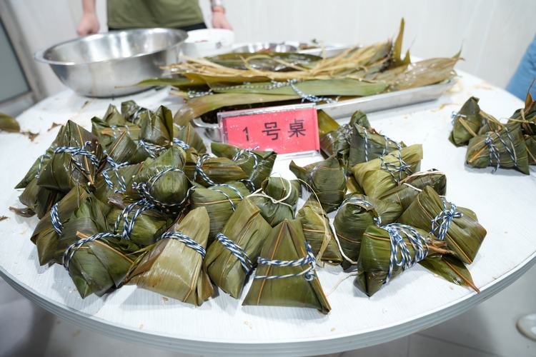 比賽開始,大家紛紛拿出自己的看家本領(lǐng),裹粽葉、填糯米、壓緊實(shí)、封口、綁粽繩。有的第一次包沒有經(jīng)驗(yàn),按之前師傅教授的方法現(xiàn)學(xué)現(xiàn)賣,有的經(jīng)驗(yàn)豐富、動作麻利,不一會兒就包出了一個棱角分明的粽子。在包粽子過程中,大家相互交流、相互學(xué)習(xí),有說有笑、其樂融融。一片片清香的粽葉、一粒粒晶瑩的糯米在大家的一雙雙巧手下,形成了一個個滿懷情誼的粽子。
