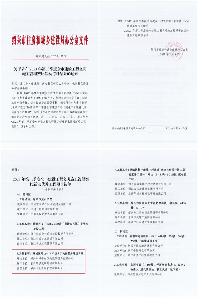 近日,紹興市住房和城鄉(xiāng)建設(shè)局辦公室下發(fā)了《關(guān)于公布2023年第二季度全市建筑工程文明施工管理賽比活動(dòng)考評(píng)結(jié)果的通知》。越城區(qū)5個(gè)項(xiàng)目榮獲第二季度全市建設(shè)工程文明施工管理賽比活動(dòng)優(yōu)秀工程項(xiàng)目,由我司承建的越城區(qū)塔山竹木市場(chǎng)BC塊安置房建設(shè)工程榜上有名。