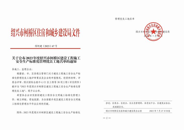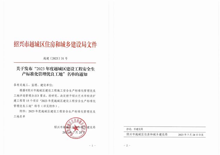 紹興市越城區(qū)住房和城鄉(xiāng)建設(shè)局發(fā)布《關(guān)于發(fā)布“2023年度紹興市越城區(qū)建設(shè)工程安全生產(chǎn)標(biāo)準(zhǔn)化管理優(yōu)良工地”名單的通知》,由我司承建的陽明故里整體開發(fā)建設(shè)項目--陽明故居及紀念館被評為“2023年度紹興市越城區(qū)建設(shè)工程安全生產(chǎn)標(biāo)準(zhǔn)化管理優(yōu)良工地”!
