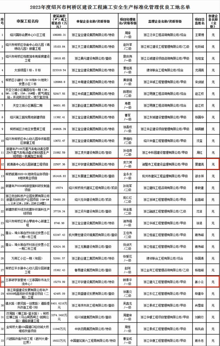 紹興市柯橋區(qū)住房和城鄉(xiāng)建設(shè)局發(fā)布《關(guān)于公布2023年度紹興市柯橋區(qū)建設(shè)工程施工安全生產(chǎn)標(biāo)準(zhǔn)化管理優(yōu)良工地名單的通知》,由我司承建的錢清鎮(zhèn)中心幼兒園新建工程項目和蘭亭研學(xué)游營地(蘭亭國際書法交流中心)兩個項目被評為“2023年度紹興市柯橋區(qū)建設(shè)工程施工安全生產(chǎn)標(biāo)準(zhǔn)化管理優(yōu)良工地”!