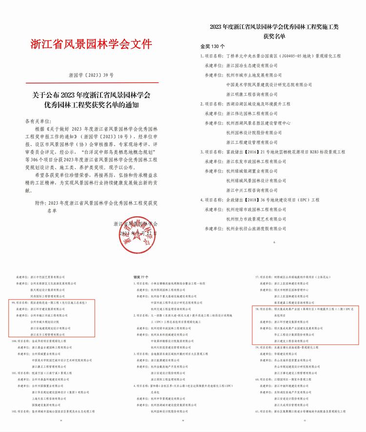 近日,浙江省風(fēng)景園林學(xué)會發(fā)文浙園學(xué)(2023)39號文,關(guān)于公布“2023年度浙江省風(fēng)景園林學(xué)會優(yōu)秀園林工程獎公布文件”的通知,我司承建的二個項目,葭沚老街改造一期工程(先行區(qū)施工總承包)榮獲“優(yōu)秀園林工程獎施工類金獎”,紹興集成電路產(chǎn)業(yè)園(皋埠片區(qū))環(huán)境提升工程(二期)EPC總承包項目榮獲“優(yōu)秀園林工程獎施工類銀獎”。