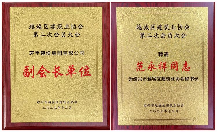 在越城區(qū)建筑業(yè)協(xié)會二屆一次理事會上,選舉產(chǎn)生新一屆理事會及領(lǐng)導(dǎo)機(jī)構(gòu)。浙江環(huán)宇建設(shè)集團(tuán)有限公司被選舉為副會長單位,集團(tuán)常務(wù)副總經(jīng)理范永祥擔(dān)任紹興市越城區(qū)建筑業(yè)協(xié)會副會長并兼任秘書長。