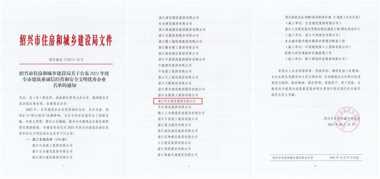 , mobileContent=近日,紹興市住房和城鄉(xiāng)建設(shè)局發(fā)布《關(guān)于公布2023年度全市建筑業(yè)誠信經(jīng)營和安全文明優(yōu)秀企業(yè)名單的通知》,環(huán)宇集團位列其中,誠信建設(shè)再添殊榮。