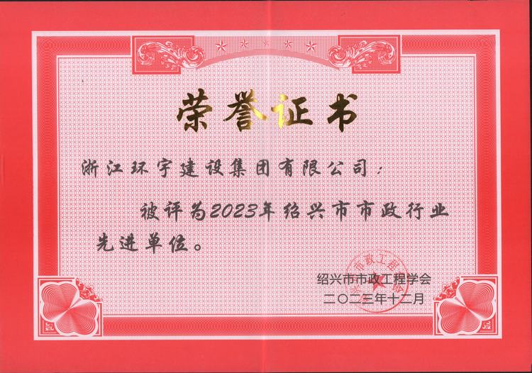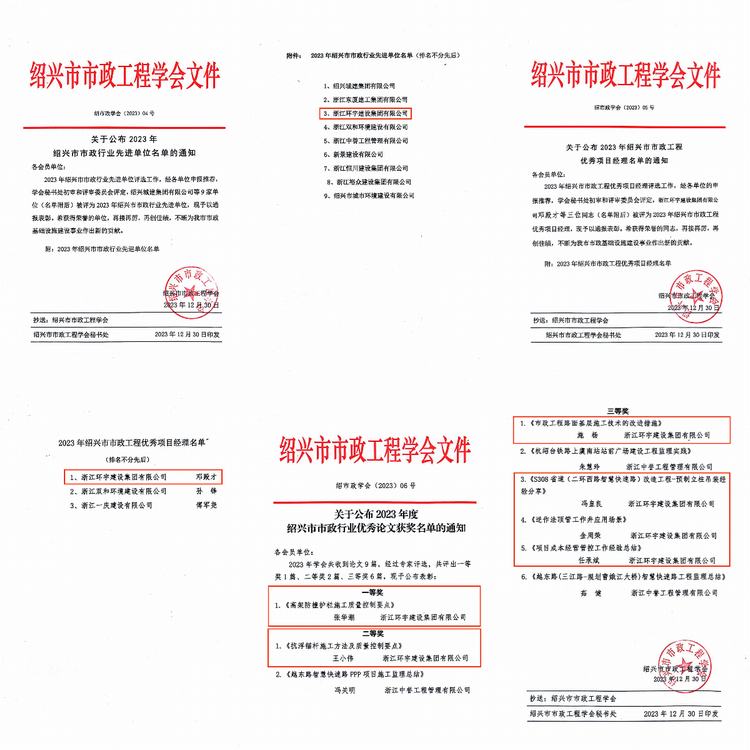 環(huán)宇集團榮獲2023年紹興市市政行業(yè)先進單位,鄧殿才榮獲2023年紹興市市政工程優(yōu)秀項目經(jīng)理,張華潮撰寫的《高架防撞護欄施工質(zhì)量控制要點》榮獲紹興市市政行業(yè)優(yōu)秀論文一等獎,王小偉撰寫的《抗浮錨桿施工方法及質(zhì)量控制要點》榮獲優(yōu)秀論文二等獎,施楊、馮皇良、金周榮、任承斌四人撰寫的論文榮獲優(yōu)秀論文三等獎。