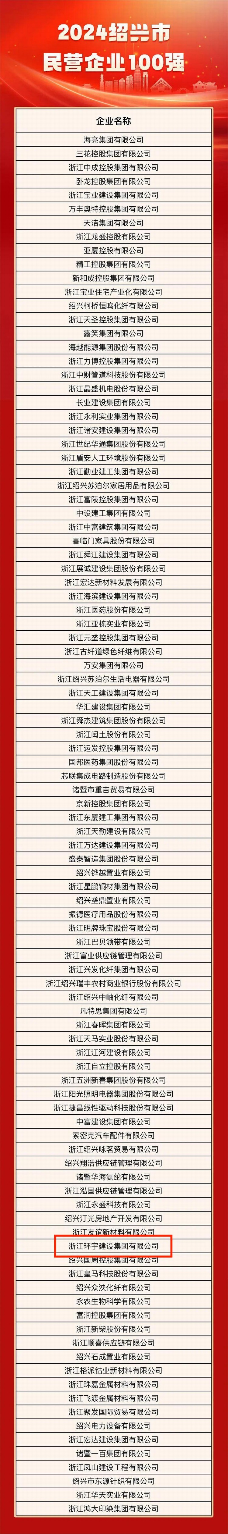 {id=883, tenantId=null, version=null, appId=null, viewType=null, sourceApp=null, useViewType=false, authData=null, jsAuthority=null, title=喜訊——環(huán)宇集團(tuán)榮獲“2024紹興市民營企業(yè)100強(qiáng)”和“2024紹興市民營企業(yè)就業(yè)貢獻(xiàn)30強(qiáng)”, type=1, summary=?5月27日晚上,以“向新而行 企航未來”為主題的2024紹興“愛企行動(dòng)”系列活動(dòng)啟動(dòng)儀式舉行。我司建設(shè)集團(tuán)董事長宋良應(yīng)邀出席。, keywords=, createDate=1716973911000, modifyDate=1716974296000, pubDate=1716973911000, showFlag=true, topFlag=false, recommandFlag=false, viewCount=0, linkUrl=, targetFlag=false, mobileTitle=喜訊——環(huán)宇集團(tuán)榮獲“2024紹興市民營企業(yè)100強(qiáng)”和“2024紹興市民營企業(yè)就業(yè)貢獻(xiàn)30強(qiáng)”, mobileSummary=?5月27日晚上,以“向新而行 企航未來”為主題的2024紹興“愛企行動(dòng)”系列活動(dòng)啟動(dòng)儀式舉行。我司建設(shè)集團(tuán)董事長宋良應(yīng)邀出席。, author=, source=, showMobileFlag=true, accessPermission=, showOrder=883, showStyle=, topOrder=0, content={id=883, tenantId=null, version=null, appId=null, viewType=null, sourceApp=null, useViewType=false, authData=null, jsAuthority=null, pcContent=