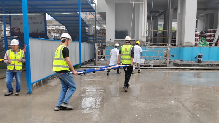 隨著本次演練指揮長吳總一聲令下,演練正式開始。本次應(yīng)急演練主要流程為吊籃操作工違規(guī)作業(yè),不慎從吊籃上墜落,項(xiàng)目經(jīng)理得知消息后,立即組織各應(yīng)急小組啟動(dòng)搶救程序。救護(hù)組對(duì)現(xiàn)場做好警戒圍擋,嚴(yán)禁圍觀人員拍照;醫(yī)療組檢查傷者情況,當(dāng)即判斷必須盡快送至醫(yī)院;指揮組安排應(yīng)急車輛進(jìn)場,后勤組對(duì)接就近醫(yī)院安排傷員接收事宜;救護(hù)組將傷者轉(zhuǎn)移到應(yīng)急車輛上,過程中防止傷者二次受傷,醫(yī)療組隨車陪同送至醫(yī)院治療。