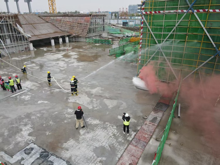 上午10點18分,火災(zāi)撲救和應(yīng)急疏散演練率先拉開帷幕。工地北側(cè)模擬火災(zāi)現(xiàn)場濃煙滾滾,項目部迅速啟動應(yīng)急預(yù)案。滅火組人員攜帶滅火器材第一時間趕赴現(xiàn)場查看“火情”,并同步撥打“119”報警。參與演練的人員迅速撤離至安全區(qū)域,整個逃生過程快速、安全、有序。2分鐘后,濱海消防隊抵達現(xiàn)場,迅速展開火災(zāi)撲救工作,火勢得到有效控制。