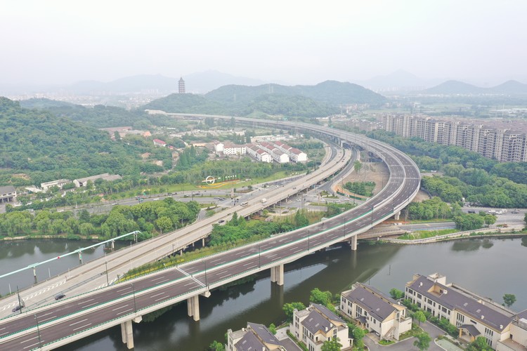S308省道(二環(huán)西路智慧快速路)改造工程北起鳳林西路以北,向南延伸,沿線跨越二環(huán)北路、蕭甬鐵路、霞西路公鐵立交、鑒湖大橋、漓鐵專用線、亭山立交,終于文淵路(常禧路)東側(cè),接二環(huán)南路高架橋梁。采用“高架主線+地面輔道”的建設(shè)形式,高架主線建設(shè)標(biāo)準(zhǔn)為城市快速路兼顧一級(jí)公路,設(shè)計(jì)車速80km/h,高架段采用雙向6車道規(guī)模;地面輔道建設(shè)標(biāo)準(zhǔn)為城市主干路,設(shè)計(jì)車速50 km/h,采用雙向4車道規(guī)模;設(shè)置的平行匝道和立交匝道的設(shè)計(jì)車速均為40km/h。工程于2019年8月21日開(kāi)工,于2023年6月20日通過(guò)竣工驗(yàn)收后投入使用。