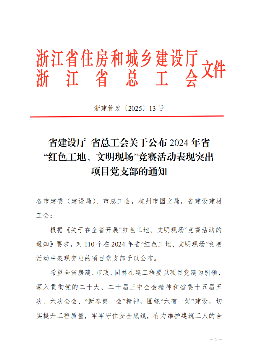 【概要描述】近日,省建設(shè)廳、省總工會公布了《關(guān)于2024年省“紅色工地、文明現(xiàn)場”競賽活動(dòng)表現(xiàn)突出項(xiàng)目黨支部的通知》,越東路二期Ⅰ標(biāo)項(xiàng)目臨時(shí)黨支部獲得表彰。